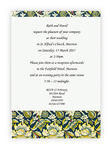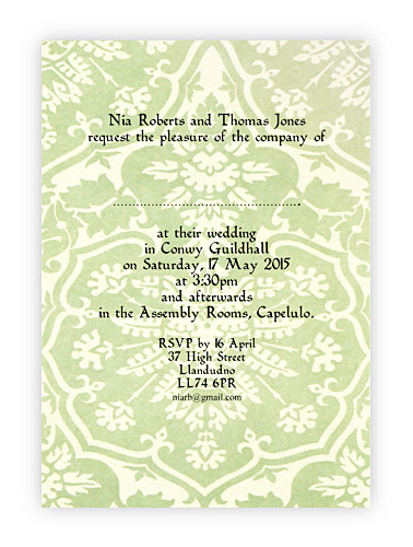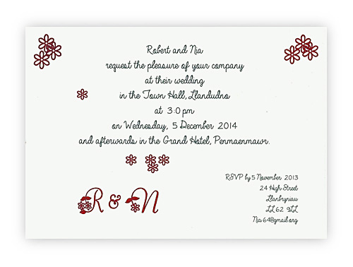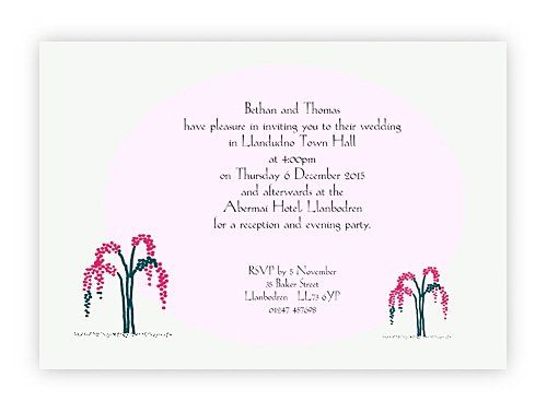 Introducing our new Influences Collection. Invitations are produced with a single card 12.5cm x 17.5cm. You may choose Welsh, English or bilingual – which is achieved by printing on both sides of the card. Inspirations for the designs include Art Nouveau, the Arts and Crafts movement, Chinese textile designs and Celtic knotwork. The simplicity of the cards is reflected in the price range, which you will find to be very reasonable.